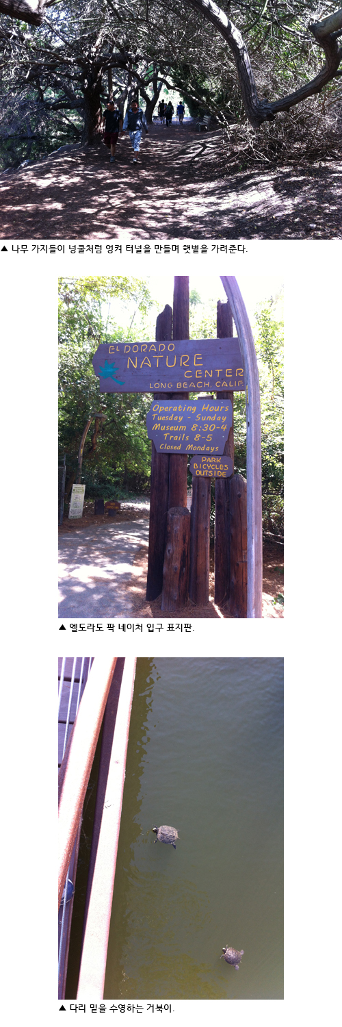 롱비치 엘도라도팍 모퉁이에 아담하게 자리 잡은 ‘야생생물원' 네이처센터(Nature Center). 하늘을 찌를 듯 치솟은 참나무와 삼나무, 오리나무들이 줄을 이어 숲길을 만든다. 스컹크,여우, 족제비, 다람쥐, 매, 오리 등 야생동물과 조류들이 뛰고 날며 사람의 발길을 반기는 곳이다.