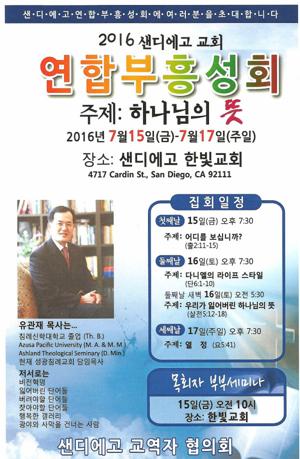 샌디에고 교역자협의회(회장 이호영목사)가 주관하는 ‘2016 연합부흥성회’가 오는 15~17일 한빛교회에서 열린다.