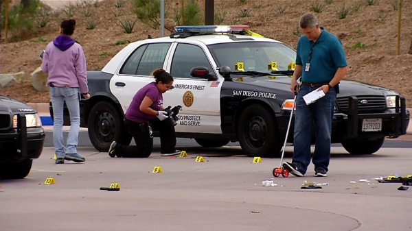 지난 토요일 토리파인스 하이스쿨에서 발생한 총격사건 현장에서 수사 경찰관들이 현장에서 사건 증거를 수집하고 있다(7 뉴스 사진)