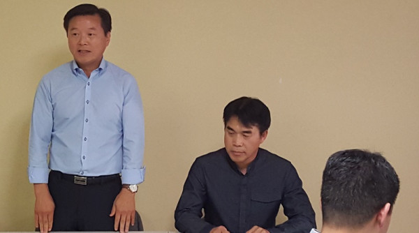 김병대 한인회장이 골프대회 결산보고와 함께 신규 사업인 청소년 정체성 캠프에 대해 설명하고 있다.