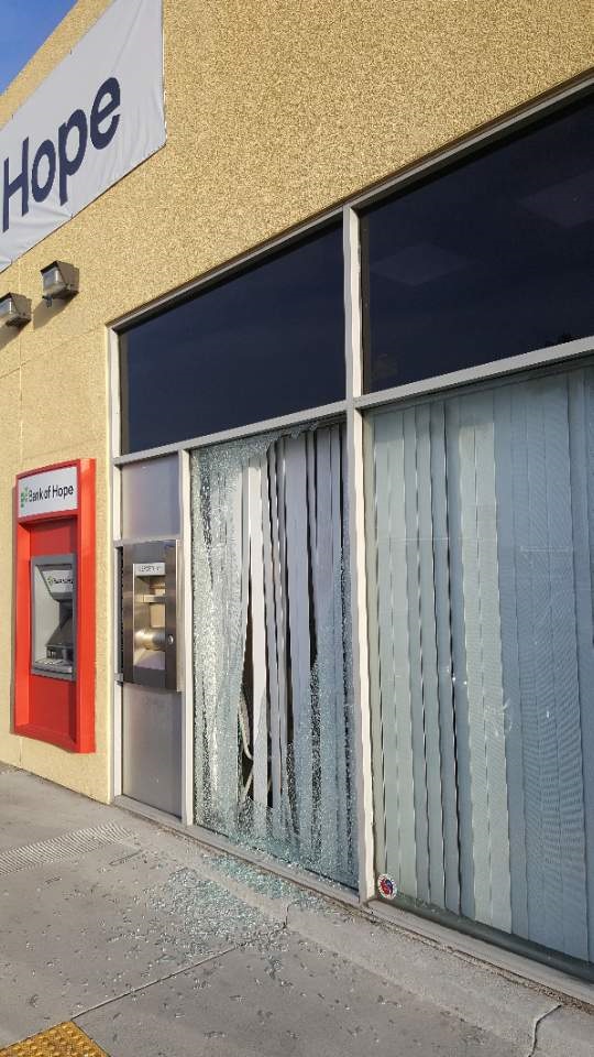 콘보이에 있는 한인은행 뱅크오브호프 대형 유리창이 파손되는 사건이 지난 16일 발생됐다.