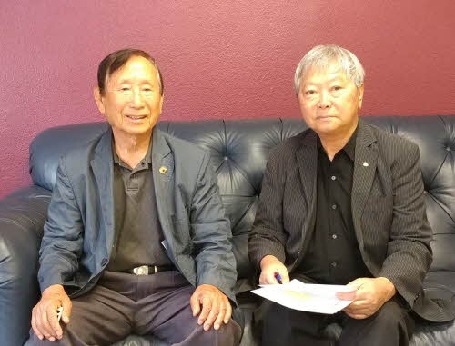 한미노인회 김기홍 회장(왼쪽)이 김 훈 상조회 운영위원장과 함께 상조회 성격에 대해 설명하고 있다.
