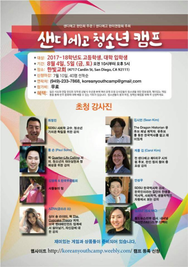 8월에 한인회가 주관하고 한미연합회가 주최하는 ‘샌디에고 청소년 캠프’ 포스터