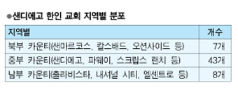 지역별로는 샌디에고, 파웨이, 스크립스 랜치 등 한인 주거와 상권이 밀집되어 있는 중부 지역이 총 43개로 전체의 73%를 차지했으며 그 뒤를 이어 출라비스타, 내셔널 시티가 있는 남부 지역이 8개, 샌마르코스, 칼스배드, 오션사이드 지역의 북부 지역이 7곳이 있는 것으로 집계됐다.<도표 참조>