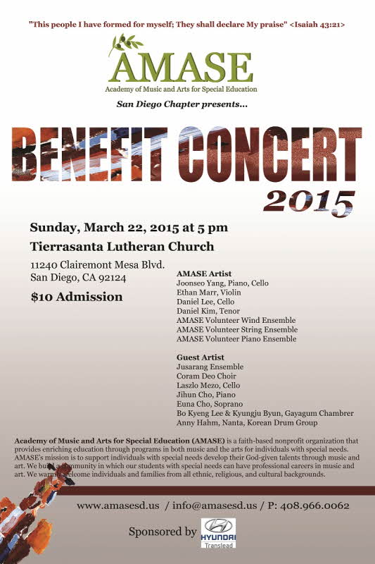 발달장애우들의 예술적 재능을 발굴하고 육성하는 비영리교육기관이 어메이즈(AMSE)가 오는 22일(일) 오후 5시 티에라센터 루터란 교회(Tierrasanta Lutheran Church)에서 ‘2015년도 베네핏 콘서트’를 개최한다.