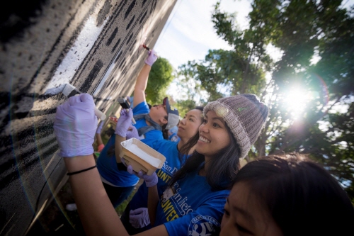 UC 샌디에고 학생들이 자원봉사활동단체인 ‘발렌티어 50’에서 펼친 벽 낙서를 지우고 페인트로 단장하고 있다.<Volunter50 사진>