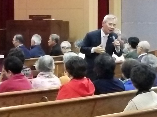 5월 11일 한미노인회 임시총회 당시 임시회장으로 추대된 후 회원들에게 소감을 밝히고 있는 모습