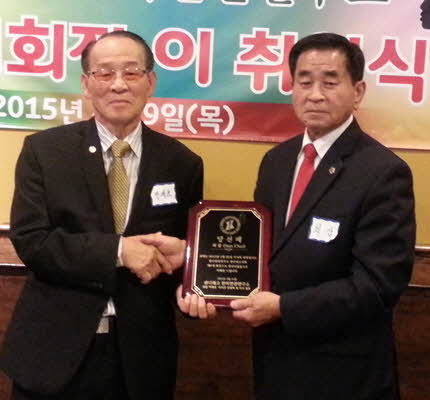 인권연 박재효 전 회장이 제 6대 회장으로 선출된 최삼(오른쪽) 신임회장에게 당선패를 전달하고 있다.