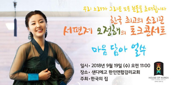 서편제 여주인공으로 활약한 오정해 씨가 오는 19일 샌디에고 연합감리교회에서 콘서트를 개최한다.