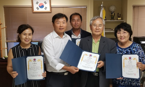 제34대 SD 한인회장 선관위원들이 위촉장을 받고 공명선거를 다짐하고 있다. 맨 왼쪽부터 김선유 한인회 부회장, 김병대 한인회 비상운영위원장, 박회병 한인회 비상운영위원, 한청일 시니어 회장. 안젤라 홍 상공회의소 부회장