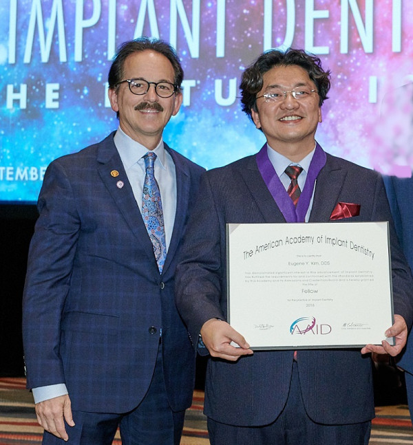 샌디에고종합치과그룹 김유진 원장(오른쪽)이 지난 달 30일 달라스에서 열린 제76차 AAID(미 치아의식 아카데미)에서 미 치아의식 임플란트 학회로부터 펠로우 인증 자격을 수여받았다.
