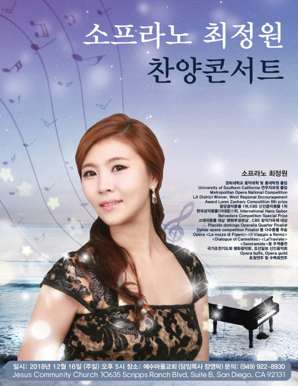 소프라노 최정원 찬양콘서트가 오는 16일(주일) 오후 5시 예수마을교회(10635 Scripps Ranch Blvd. Suite B. SD)에서 열린다.