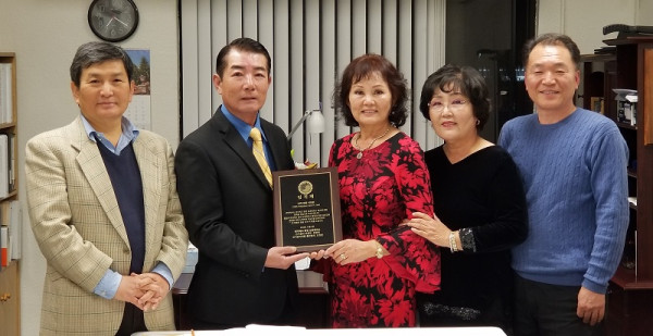 샌디에고 한인상공회의소 회장에 무투표 당선된 이희준 고문(왼쪽에서 두 번째부터)이 정병애 선거관리위원장으로부터 당선패를 전달받고 있다.