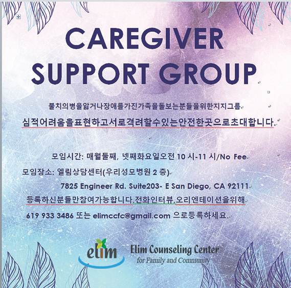 오는 26일(화) 샌디에고 우리성모병원 2층에 자리 잡고 있는 엘림상담센터에서 열리는 이 모임의 공식 명칭은 ‘가족 간병인 지지 그룹(Caregiver Support Group)이다.엘림상담센터에의 백이숙 임상심리사는 “한국 문화는 치매를 비롯한 각종 질환을 앓고 있는 환자를 간병하면서 많은 어려움을 겪고 있지만 이를 표현하는 것에 대해 터부시하고 있다”며 “이로 인해 간병인들이 심적 부담과 정신적 스트레스를 해소할 마땅한 곳이 없다. 결국 이에 대한 피해는 고스란히 환자에게 돌아가는 악순환으로 이어진다”고 말했다.