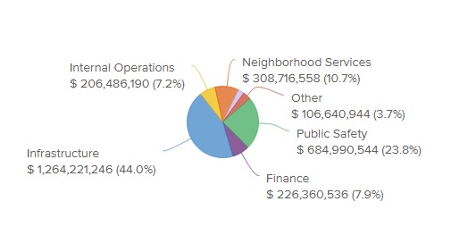 시 예산부처가 시의회에 제출된 2015~16년도 예산 편성표에 따르면 전체 예산의 44%($1,264,221,246)가 사회기반시설에, 공공안전에 23.8%($684,990,544), 주민 서비스 10.7%($308,716,558) 순으로 되어 있다.<도표 참조>