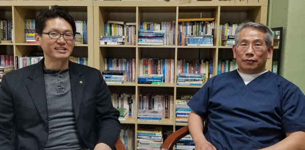 예수마을교회 담임 장영락목사(왼쪽)와 Element Care Acupuncture 오영식 원장이 한방 의료봉사를 시작하게 된 이유에 대해 설명하고 있다.