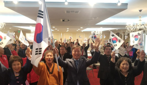 샌디에고 백황기 회장을 비롯한 참석자들이 김병대 전 한인회장의 선창에 따라 만세삼창을 외치고 있다.
