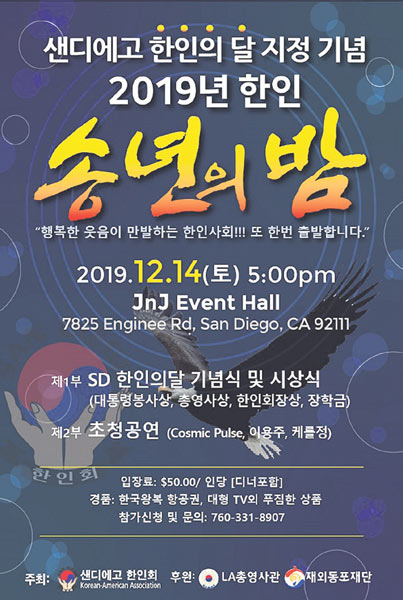 샌디에고 한인회(회장 백황기)는 오는 14일(토) J&J 이벤트 홀(7825 Engineer Rd. SD)에서 ‘샌디에고 한인의 달 지정 기념 2019 송년의 밤’ 행사를 개최한다.오후 5시에 열리는 이번 행사는 LA 총영사관과 재외동포재단이 후원하며 입장료는 50달러다(저녁식사 포함).