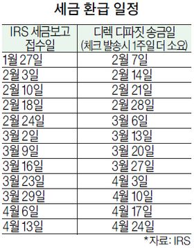 이에 소득세 신고를 마친 납세자들은 환급금을 받는 날에 관심이 많다. 추가 체크가 필요한 EITC와 추가자녀세금크레딧(ACTC) 신청자는 빨리 접수했다고 하더라도 2월 15일까지 환급이 진행되지 않았다. 국세청(IRS)의 세금 환급 스케줄을 표로 정리했다.