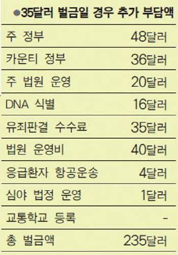 과속으로 인해 단속 경찰에 적발됐을 경우 처음 부과되는 벌금은 35달러다. 그러나 법원 수수료(Court Operations Assessment) 40달러를 포함해 각종 금액을 추가되면서 단속대상자가 최종적으로 내야 하는 벌금은 14.89% 늘어난 235달러로 껑충 뛰어오른다.<도표 참조>