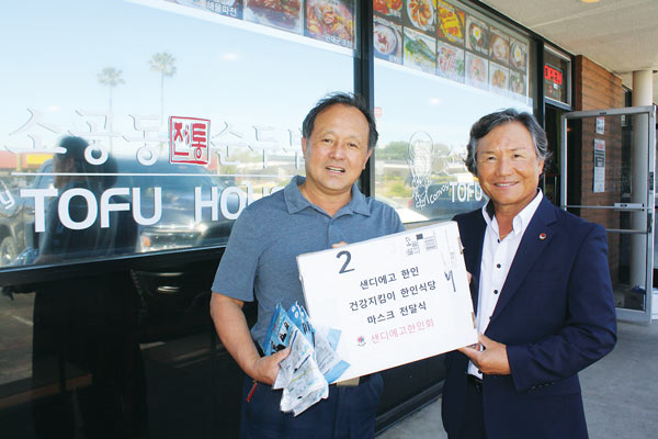 샌디에고 한인회(회장 백황기)는 코로나19 직격탄으로 어려움에 처한 한인타운에 위치한 한인식당 등에 마스크를 전달했다. 이날 전달한 마스크는 LA총영사관에서 샌디에고 한인회에 기부한 402개의 마스크 중 일부이다.