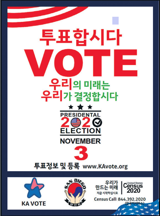SD 한인회와 한미연합회(총회장 제니 김)는 캠페인을 통해 샌디에고지역 각 유관단체와 함께 유권자 등록 및 11월3일 대통령 선거에 보다 많은 한인들이 참여할 수 있도록 힘을 모으고 있으며, 포스터(사진)를 제작해 한인들에게 안내하고 있다.
