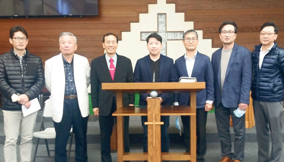 ▲ 샌디에고 교역자협의회 정기총회에 참석한 신구 임원진들. 왼쪽부터 장영락 목사, 이필성 목사, 심규섭 목사, 양사무엘 목사, 김용태 목사, 김종률 목사, 이병희 목사