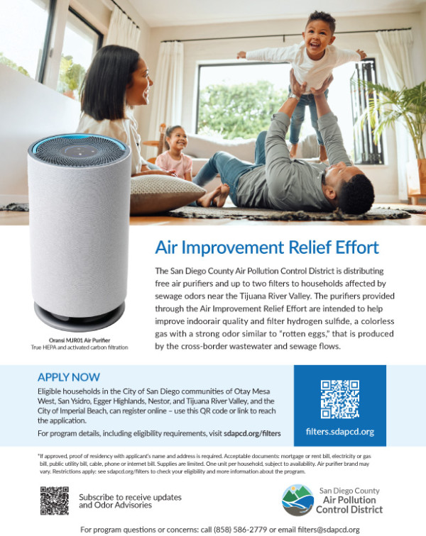 SDAPCD는 ‘대기 개선 구제 노력(AIR Improvement Relief Effort, AIRE)’ 프로그램을 통해, 티후아나 리버 밸리를 포함한 인근 지역 주민들에게 공기청정기를 무상으로 제공한다고 밝혔다. 이 프로그램은 멕시코에서 흘러 들어오는 하수로 인해 발생하는 심각한 악취 문제를 완화하기 위해 시행되고 있다.