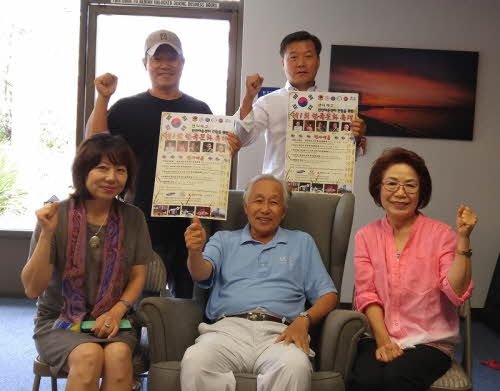 한인회관 건립 기금을 위한 ‘제1회 한국문화 축제’에 참가하고 있는 각 단체장들이 지난 17일 노인회관에서 정기 모임을 가진 후 한 자리에 모였다. 앞 줄 맨 왼쪽부터 시계방향으로 황정주(한국의 집 대표), 유석희(노인회장), 한춘진(무용협회 회장), 김병대(한인회 이사장), 박호진(풍물학교 상쇠)