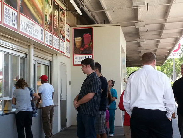 지역 주민들의 가계 부담이 개선되지 않으면서 소비형태가 위축되고 있다. 점심 식사를 아끼기 위해 코스트코 패스트푸드 점을 찾은 고객들을 줄을 서서 기다리고 있다.