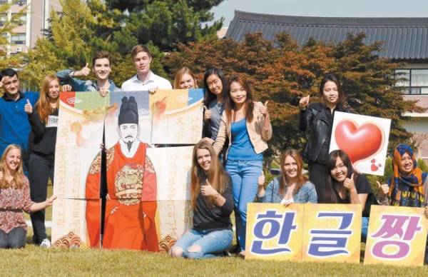 ▲ 7일 한국 대전 지역 한남대에서 열린 '제11회 전국 외국인 한국어 말하기.글짓기 대회'에 참가한 외국인들이 세종대왕의 그림과 한글이 적힌 팻말을 들고 있다. 이날 모인 외국인들은 제569회 한글날을 앞두고 그동안 갈고닦은 한국어 글쓰기와 말하기 솜씨를 겨뤘다.