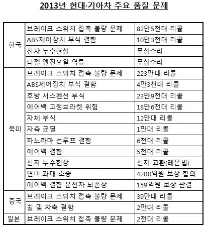 중국에서 브레이크등 결함과 K5 및 싼타페의 ‘휠·차축 결함’으로 41만여대가 시정 조치 내려졌으며, 철수한 일본에서 쏘나타·그랜저·i30 등 6개 차종 2천대 규모의 리콜이 실시됐다.