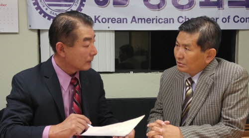 SD 한인상의 이희준 회장(왼쪽)이 임종은 이사장과 함께 바자회 개최 일정에 대해 의견을 나누고 있다.
