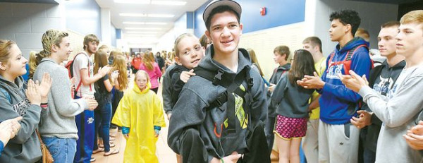폭스뉴스는 21일 미시간주 남동부 템퍼런스에 있는 베드포드 고등학교 11학년생 헌터 갠디가 20일 아홉살 남동생 브랜든을 등에 업고 렌싱 주 의사당을 향해 걷기를 시작했다고 보도했다. 헌터가 걷는 내내 업고 있을 동생 브랜든은 70파운드의 몸무게에 뇌성마비로 인해 보조장치 없이는 걸을 수가 없다.