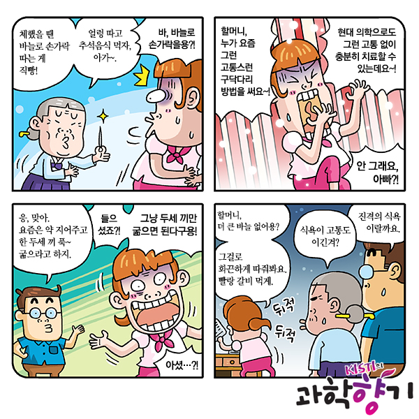 “하…, 할머니. 왜 이러세요! 제발 그 바늘 내려놓아 주세요! 체했을 때 바늘로 손가락 끝을 따면 낫는다는 건, 말짱 다 거짓말이라고요. 그치 아빠?”