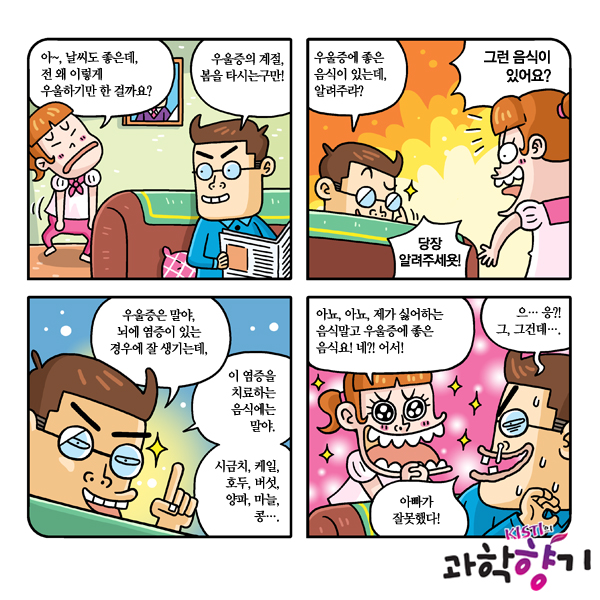 “제일 좋은 건 햇볕을 쬐는 거지. 하루 30분 이상 따뜻한 볕을 쬐며 산책을 하면 세로토닌 분비가 활발해져 스트레스가 줄어들고 긍정적인 감정을 느끼게 된다는구나. 또 뭔가 집중할 수 있는 즐거운 거리를 만들거나, 편한 사람과 신나게 수다를 떠는 것도 도움이 되지. 그리고 무엇보다 뇌 건강에 도움이 되는 음식을 찾아 먹는 것도 우울증 치료에 효과적이란다.”