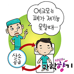 그래서 숨을 쉬지 못 할 뿐만 아니라, 폐의 기능 자체에 문제가 생긴 환자들을 위해 등장한 것이 바로 에크모다. 에크모(ECMO, 체외막산소화장치)란 Extra-Corporeal Membrane Oxygenation란 말 그대로 ‘몸 밖에서 막을 통해 산소를 공급하는 장치’다. 즉, 에크모는 환자의 혈액 속의 이산화탄소를 제거하고 산소를 주입해 몸속으로 돌려보내는 일을 하는 장치로, 폐포가 하는 일을 대신하는 인공 폐인 것이다.