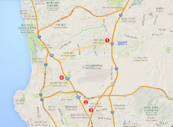 ▲ 1-H마트, 2-시온마켓, 3-샌디에고 코리아타운사, 4-UTC샤핑센터 및 UCSD 학교