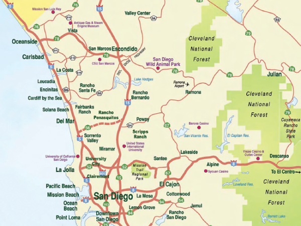 동쪽 지역을 보면 동북쪽부터 Poway가 있다. 이곳도 생활환경이 매우 우수하여 많은 한국 사람이 주거지로 선호하는 지역이다. UCSD 까지는 자동차로 20분 정도는 가야한다. 이곳은 기본적으로 80 ~ 90 km로 달리기 때문에 소요 시간에 비해 실제 거리는 먼 편으로 생각해야 한다.
