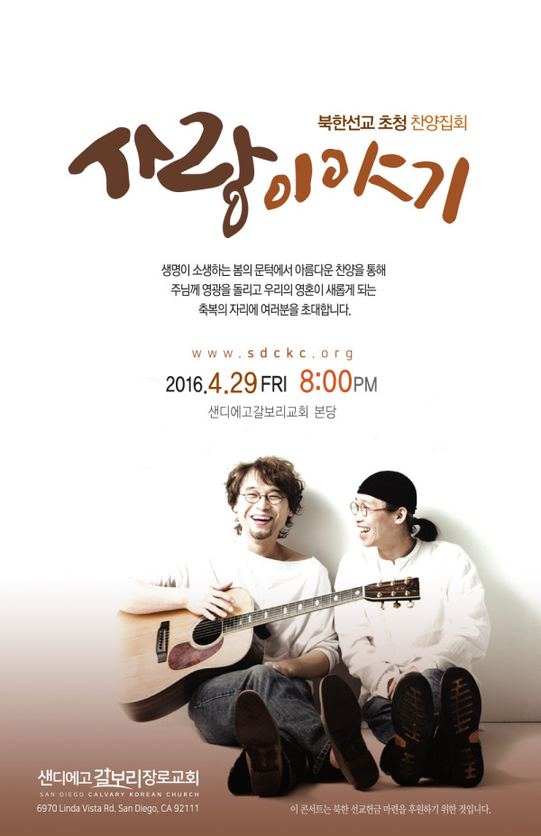 샌디에고 갈보리교회에서는 오는 4월 29일(금) 북한선교 초청 찬양집회를 갖는다.