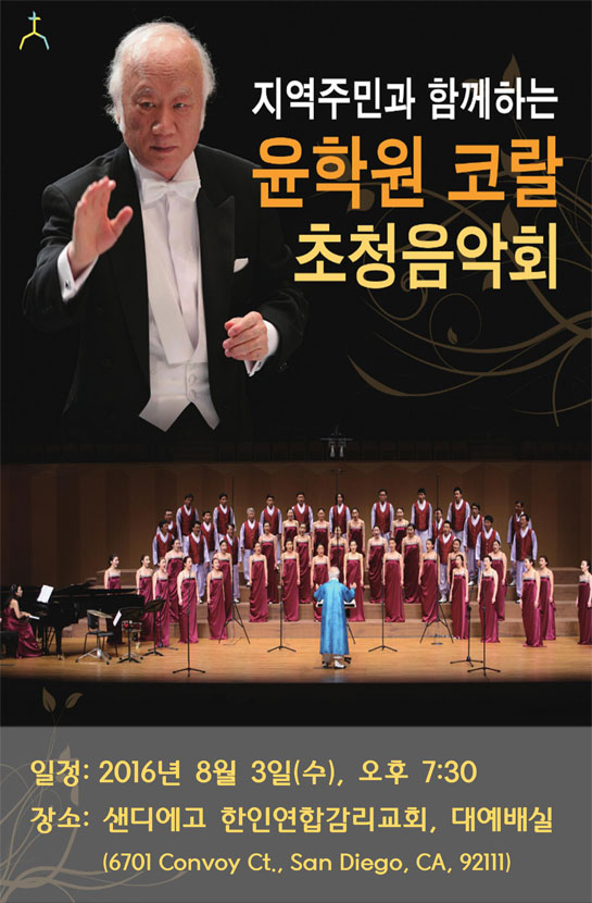 샌디에고 한인연합감리교회(담임 이성현목사)가 오는 8월 3일(수) 오후 7시30분 ‘지역주민과 함께하는 극동방송 윤학원 코랄 초청음악회’를 갖는다.